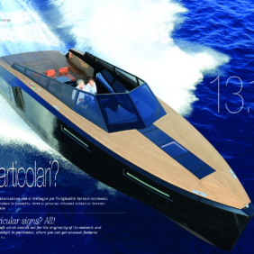 È un tredici metri voluto per stupire, con tan­te idee proiettate nel futuro, ma c’è anche una sostanza vera fatta di tutto ciò che il di­portista può amare o di cui può necessitare, come fosse una seconda casa. L’EVO 43 ha in sé un elevato tasso di tecnologia, è costruito “intorno all’uomo” recita un loro slogan, cu­stomizzabile per renderlo il più possibile con­forme alle aspettative di una clientela che sa apprezzare la qualità ed il design e che ama distinguersi dagli altri. Grazie all’uso delle re­sine in infusione si è ottenuto un risparmio di circa il 20% del peso globale. È un’imbarca­zione su cui anche le più piccole cose, come le cerniere ad esempio, sono state costruite appositamente e solo per essa. È un prodot­to tutto italiano che si aggiunge al vanto della nostra cantieristica nel mondo, un day crui­ser di carattere che mette in mostra tutta la sua originalità nelle forme ben scandite e fi­lanti, ove una prua dritta e murate alte con­fluiscono a poppa in modo morbido ed ap­propriato.