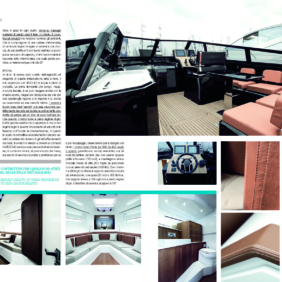 Ogni cosa è studiata per rendere ergonomica la navigazione, a cominciare dalle bitte e dai para­bordi che scompaiono per non interferire visiva­mente e fisicamente. Ciò che però attrae imme­diatamente di questo scafo è la sua “adattabilità in larghezza del pozzetto”. Pur vantando già dimen­sioni che garantiscono un notevole comfort, attra­verso un sistema elettro-pneumatico attivato con un comando digitale, si ottiene in trenta secondi l’apertura delle murate del pozzetto verso l’esterno, amplificando l’abitabilità dell’area del 40% ed ottenendo un’area pranzo, solarium o salotto larga 6,30 metri! A bordo tutto è gesti­bile da un touch screen grazie ad un gran lavoro d’impiantistica e tutto è gestibile anche attraverso l’impiego di un tablet o di un iPhone. Nel pozzet­to sono previste delle sdraio opzionali che scom­paiono nel pagliolo quando non servono, dei puff componibili per creare appunto un’area pranzo ricca di ospiti o un solarium generoso. Il tutto arric­chito da una cucina esterna dotata di 4 fuochi ad induzione ed un icebox sotto la seduta guida da 180 litri. La consolle è minimal, ma racchiude su di un piano curvilineo in legno chiaro tutto ciò che serve, avvolta da un parabrezza in cristallo da 8 mm. A poppa altra chicca, se pur opzionale. Infat­ti è possibile adottare la piattaforma poppiera in­tegrata sulla spiaggetta che meccanicamente può estendersi attraverso un movimento di 270 gradi fino a trasformarsi all’occorrenza in passerella o in sistema per scendere e risalire facilmente dall’ac­qua. Gli interni sono curati e l’altezza consente di stare in piedi in ogni punto. Vengono impiegati materiali di pregio quali il teak, il cristallo, il cuoio, tessuti pregiati che rendono luminosi gli ambienti, che si compongono di una cabina matrimoniale, di un locale bagno in legno e ceramica con doc­cia, di una dinette a V con tavolo elettrico a scom­parsa nel piano di calpestio, il tutto trasformabile in secondo letto matrimoniale, con sulla parete pro­diera un televisore/specchio da 42”.